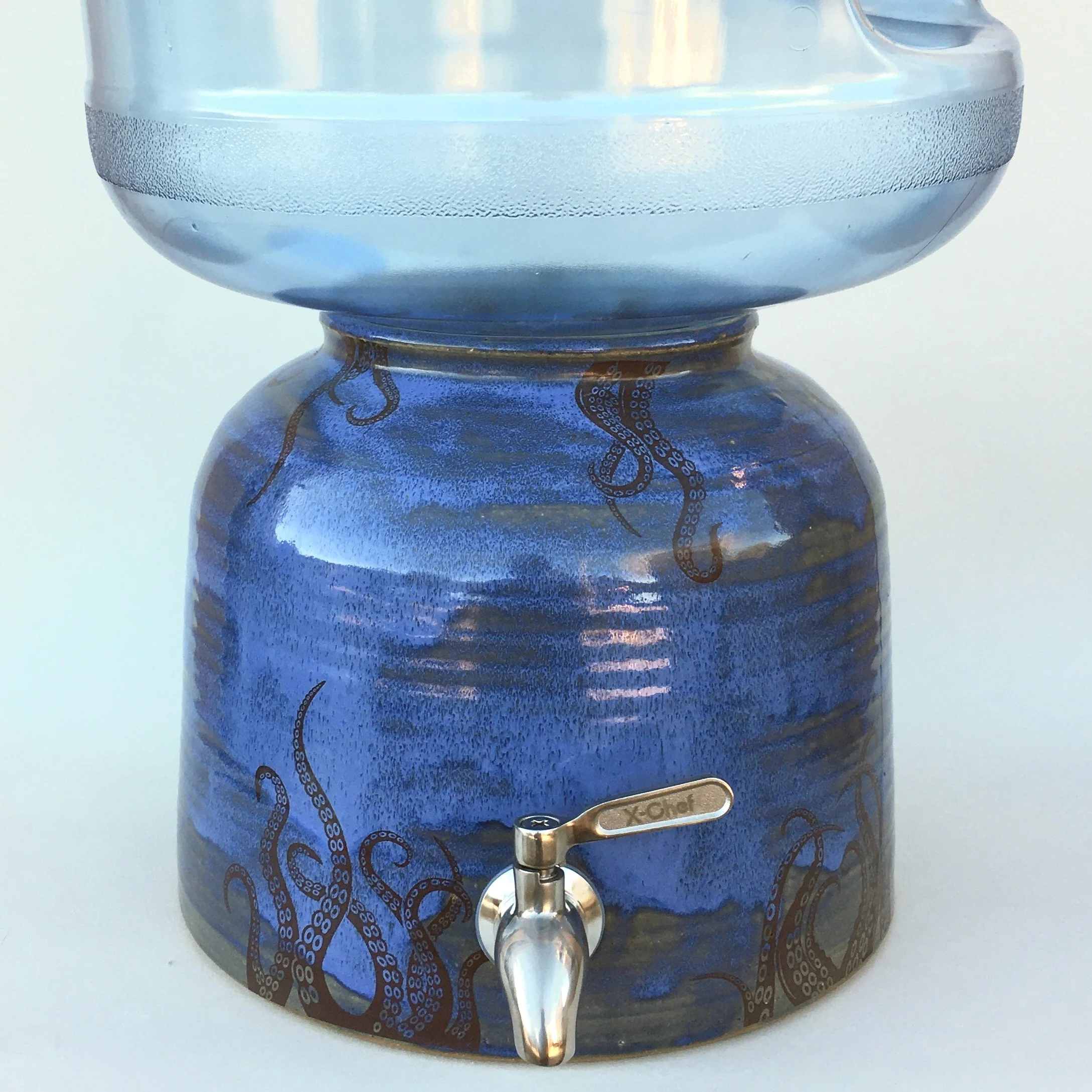This wheel-thrown water dispenser crock comes in a blue glaze with octopus tentacles.