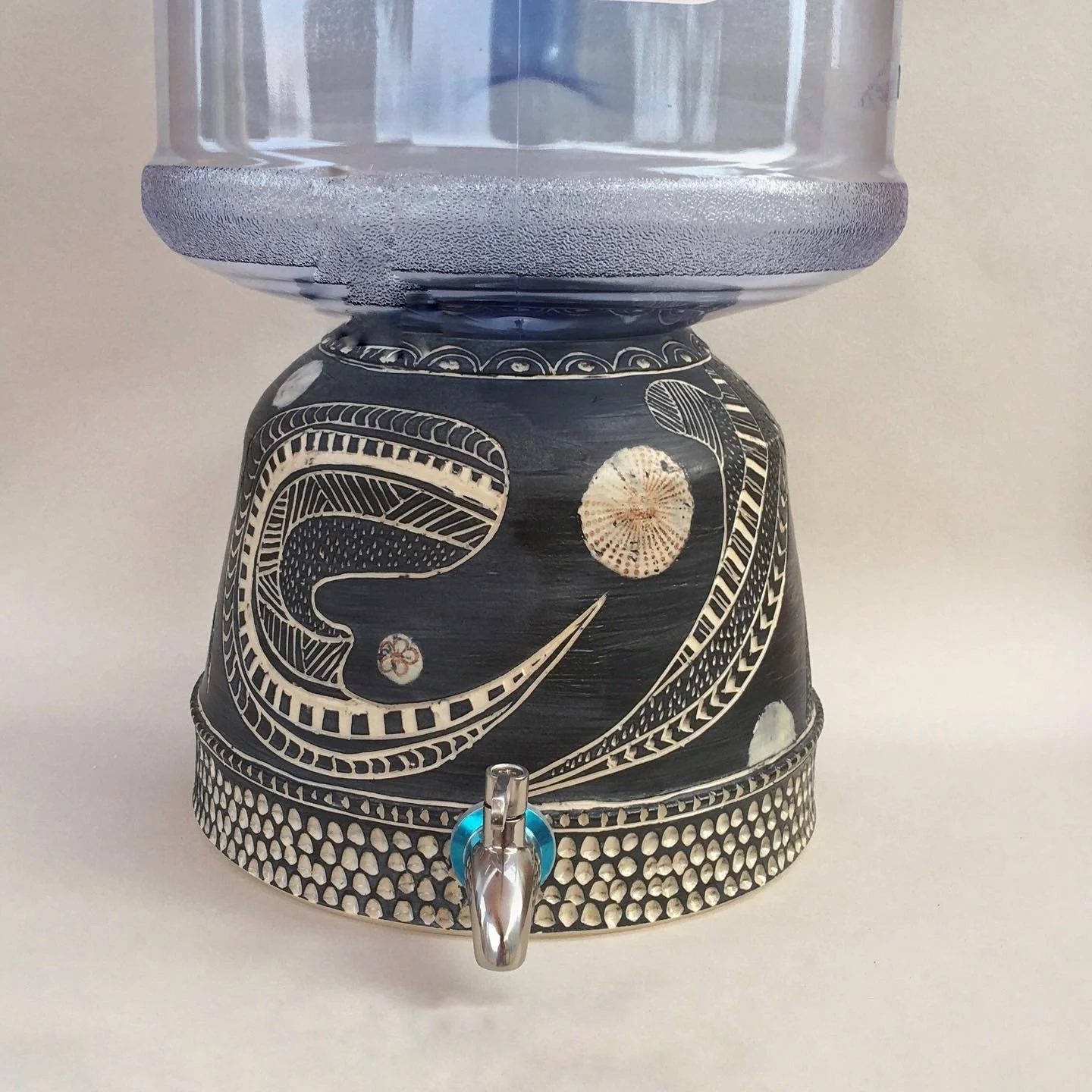 Sgraffito is a techinque where a colored slip is applied to the clay body and then carved through, exposing the color of the clay body underneath.